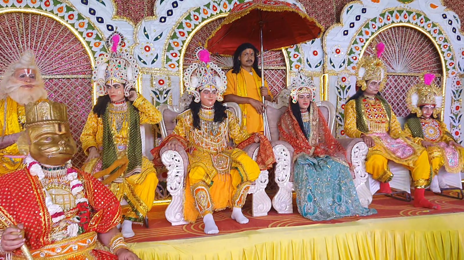 श्री रामलीला सभा रजि0 के तत्वाधान मे भगवान राम माता सीता भारत लक्ष्मण शत्रुघ्न भगवान हनुमान सहित राज दरबार में प्रवेश किया