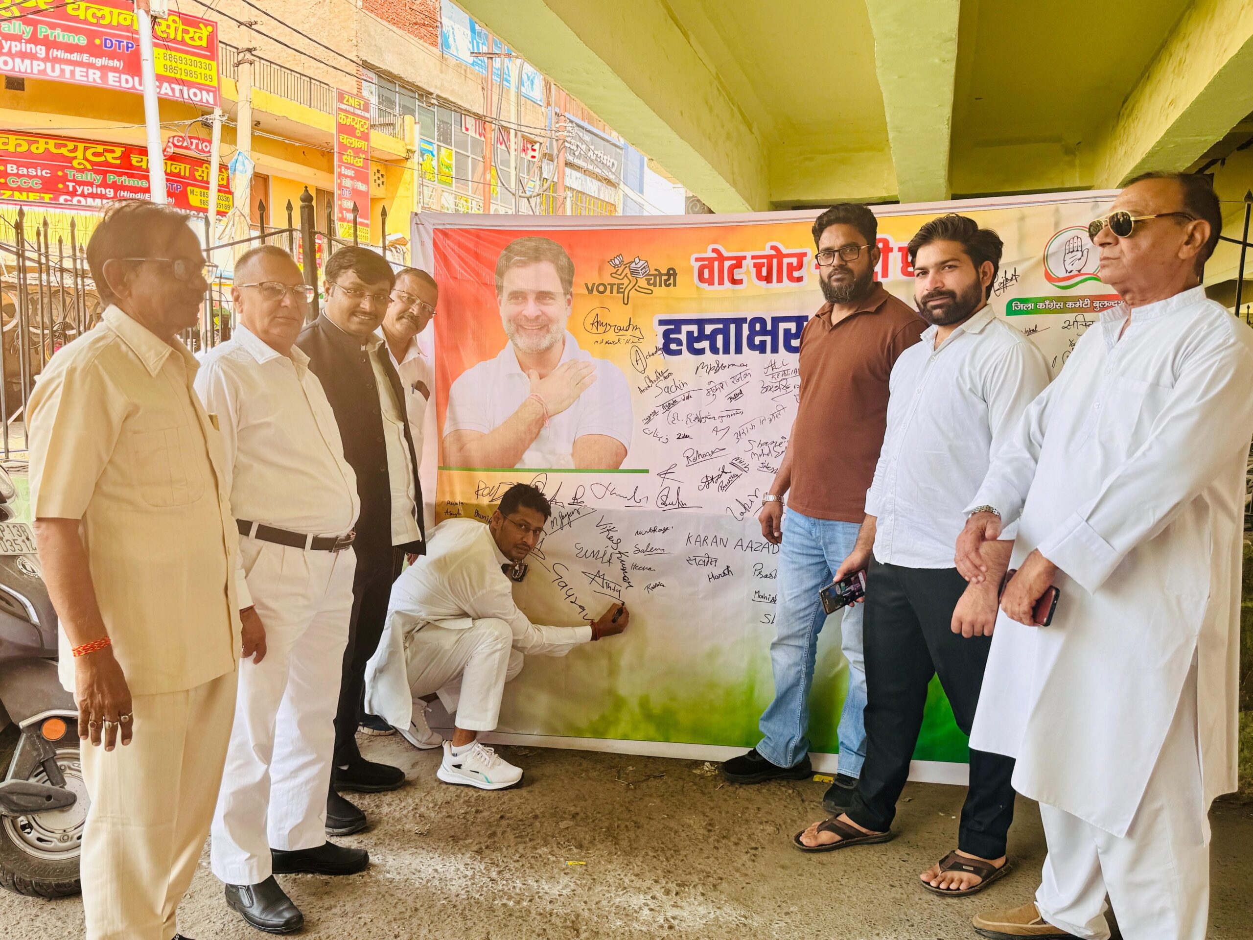 बुलंदशहर : जिला कांग्रेस कमेटी बुलंदशहर द्वारा “वोट चोर गद्दी छोड़” हस्ताक्षर अभियान आयोजित किया गया जिसमें बड़ी संख्या में छात्रों, युवाओं और आम नागरिकों ने हिस्सा लिया। जिलाध्यक्ष जियाउर्रहमान के नेतृत्व में डीएवी कॉलेज परिसर पर “वोट चोर गद्दी छोड़” व्यापक हस्ताक्षर अभियान चलाया गया। इस अभियान में बड़ी संख्या में भाग ले रहे युवाओं, छात्रों और आम नागरिकों ने उत्साहपूर्वक लोकतंत्र की रक्षा तथा पारदर्शी चुनाव प्रक्रिया की मांग के समर्थन में अपने हस्ताक्षर किए। कार्यक्रम का उद्देश्य युवाओं में मतदान की पवित्रता और जनता की आवाज़ की ताकत के प्रति जागरूकता फैलाना था। जिला कांग्रेस कमेटी के अध्यक्ष एडवोकेट जियाउर्रहमान ने कहा कि जनता का मत ही लोकतंत्र की असली ताकत है, और जो लोग वोट चोरी कर सत्ता में बने रहना चाहते हैं, उन्हें जनता जल्द ही जवाब देगी। उन्होंने कहा कि देश का प्रत्येक नागरिक वोट चोरी के खिलाफ है और निष्पक्ष चुनाव चाहता है। उन्होंने कहा कि भाजपा ने हर मोर्चे पर युवाओं, महिलाओं, किसानों और गरीबों को ठगा है।हस्ताक्षर अभियान को संबोधित करते हुए कोषाध्यक्ष मनीष चतुर्वेदी, मिंटू चौधरी, प्रशांत बाल्मिकी, देवेंद्र शर्मा और मनोज शर्मा ने कहा कि अब जनता बदलाव के मूड में है और कांग्रेस पार्टी ही देश को सच्चे लोकतांत्रिक रास्ते पर ले जा सकती है। भाजपा और चुनाव आयोग का गठजोड़ लोकतंत्र के लिए खतरनाक है।वरिष्ठ नेता महेश शास्त्री, नईम मंसूरी और आदर्शदेव शर्मा ने कहा कि भाजपा के खिलाफ सिर्फ कांग्रेस लड़ाई लड़ रही है। देश और संविधान बचाने की लड़ाई में लोगों का उत्साहपूर्वक सहयोग मिल रहा है। कांग्रेस द्वारा चलाए गए हस्ताक्षर अभियान को शहर के युवाओं से भारी समर्थन मिला और यह संदेश दिया गया कि बुलंदशहर की जनता अब वोट चोरी बर्दाश्त नहीं करेगी।इस अवसर पर कांग्रेस जिलाध्यक्ष जियाउर्रहमान, नरेंद्र चौधरी, महेश शास्त्री, सुभाष गांधी, प्रशांत बाल्मिकी, मनीष चतुर्वेदी, नईम मंसूरी, साजिद गाजी, मिंटू चौधरी, अरफात अली, देशदीपक भारद्वाज, सचिन वशिष्ठ, मुकेश रजक, आशु कुरैशी, देवेंद्र शर्मा, कुंवर आदिल, कुंवर लुकमान, हाफिज जीशान, रहमत अली, नरेश शर्मा टीटी, आदर्श देव शर्मा, मनोज शर्मा एड, साहिल खान, अब्दुल रहमान, भूमिका, निशा, शिवम, अनिल महाराज, भूमिका, निशा, प्रज्ञा, अर्शी आदि मौजूद रहे।