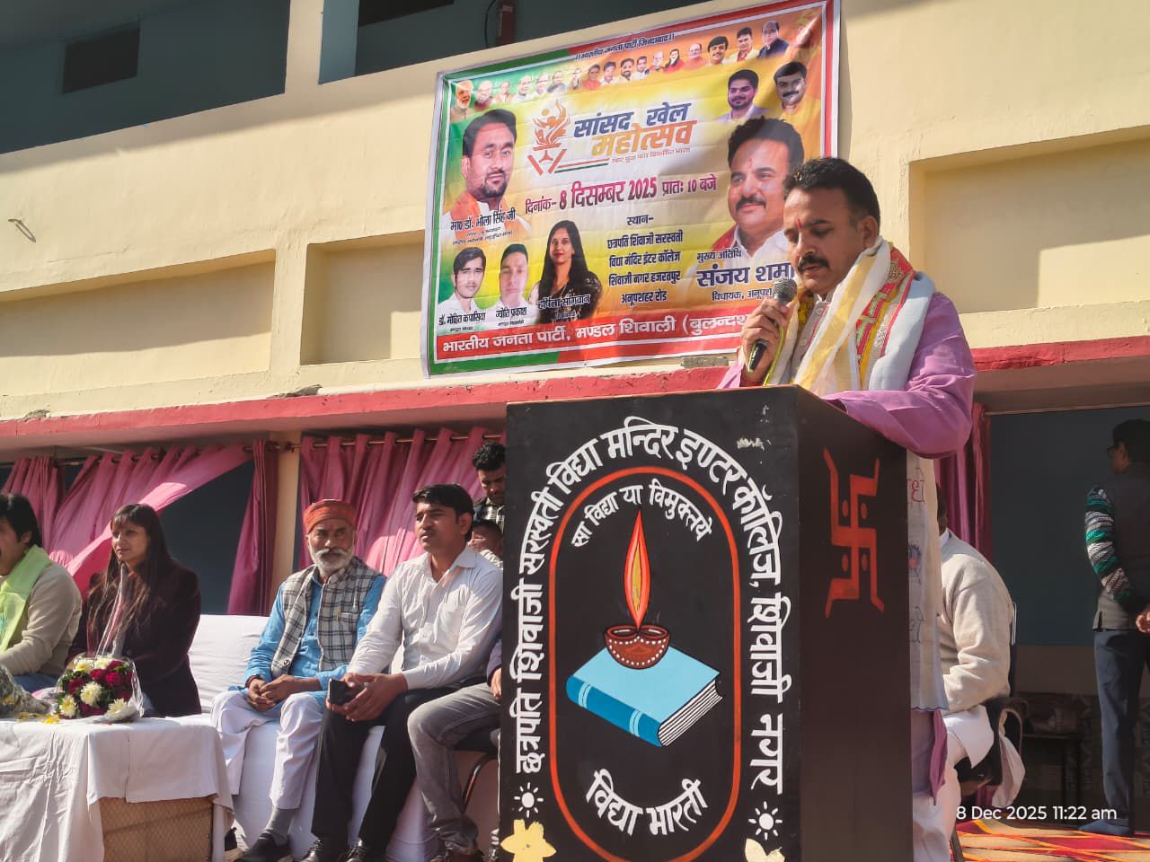 बुलंदशहर : में न्याय पंचायत स्तरीय सांसद खेल स्पर्धा 2025 के अंतर्गत आज दिनांक 08/12/2025 को बुलंदशहर विकास खंड की न्याय पंचायत उटरावली, मिर्जापुर तथा इमलिया की खेलकूद प्रतियोगिता छत्रपति शिवाजी सरस्वती विद्या मंदिर इंटर कॉलेज के खेल मैदान पर सम्पन्न हुई जिसका शुभारंभ मा॰ विधायक अनूपशहर श्री संजय शर्मा जी द्वारा फीता काटकर किया गया। इस अवसर पर संसद खेल स्पर्धा की विकास खंड बुलंदशहर के संयोजक ठाकुर सतेंद्र सिंह, सांसद प्रतिनिधि धर्मेंद्र काली, मोहित कपासिया मंडल अध्यक्ष, बिल्लू पंडित मंडल अध्यक्ष, प्रमोद शर्मा पूर्व मंडल अध्यक्ष, गौरव मित्तल पूर्व मंडल अध्यक्ष, इंजीनियर प्रशांत कुमार, ज्योति प्रकाश मंडल महामंत्री, सतवीर प्रधान, अवधेश चौहान, दीपचंद लोधी, सुबान पाहट, जमील खाँ आदि अन्य जनप्रतिनिधि मौजूद रहे। इस दौरान कॉलेज प्रशासन से प्रधानाचार्या हर्षिता सांगवान तथा समस्त स्टाफ ने भी उपस्थित रहते हुए प्रतियोगिता में पूर्ण सहयोग प्रदान किया।खेलकूद प्रतियोगिताओ में दौड़, लंबी कूद, कब्बड्डी, वॉलीबॉल, खो-खो, कुश्ती आदि विधाओं का आयोजन किया गया जिसमें बच्चों ने बढ़-चढ़कर हिस्सा लिया। सभी खेल प्रतियोगिताएं क्षेत्रीय युवा कल्याण अधिकारी अंकित भाटी एवं माध्यमिक तथा बेसिक शिक्षा के पीटीआई की देखरेख में सफलतापूर्वक संपन्न हुई। प्रतियोगिता में विजेता खिलाड़ी निम्नलिखित हैं:-बालक वर्ग में 100 मीटर दौड़ में आर्यव्रत व 200 मीटर दौड़ में गुरुकान्त तथा बालिका वर्ग में 100 मीटर दौड़ में गरिमा व 200 मीटर दौड़ में रूबी ने प्रथम स्थान प्राप्त किया। लंबी कूद में विशाल ने प्रथम रहे। वॉलीबॉल में संतोष इंटरनेशनल स्कूल की टीम प्रथम रही। वहीं कबड्डी में छत्रपति शिवाजी इंटर कॉलेज की टीम विजयी रही। खो-खो में बालिका वर्ग में संतोष इंटरनेशनल स्कूल तथा बालक वर्ग में छत्रपति शिवाजी इंटर कॉलेज की टीम ने बाजी मारी। कुश्ती में यश, लवलुश, हर्ष, नितेश, ऋतिक, अभय, नैतिक, उत्कर्ष, अभय शर्मा, पुनीत ने अपने-अपने वर्ग में विजेता बनकर उभरे।