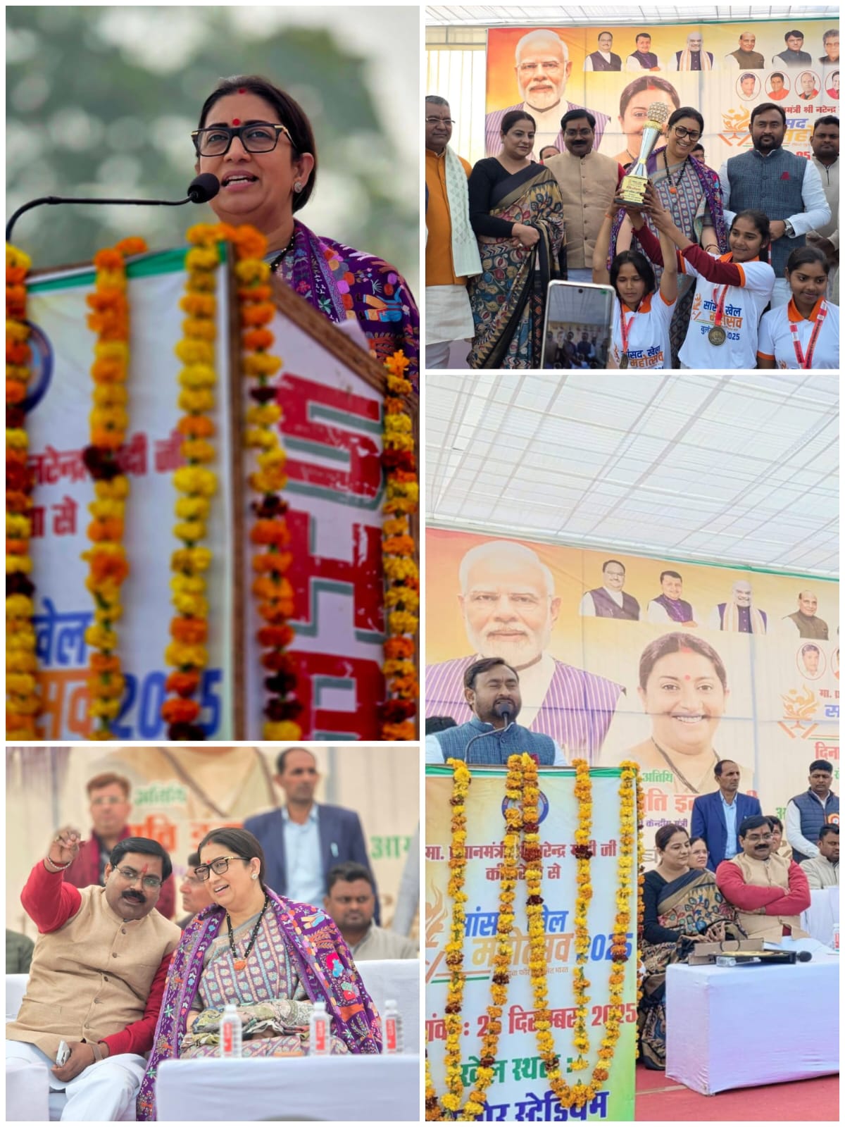 बुलन्दशहर : स्मृति ईरानी रहीं मुख्य अतिथि।बुलन्दशहर। जहांगीराबाद क्षेत्र के रामेश्वरी देवी नेत्रपाल सिंह स्पोर्ट्स स्टेडियम, खालौर में आयोजित सांसद खेल महोत्सव 2025 का समापन समारोह भव्य रूप से संपन्न हुआ। कार्यक्रम की मुख्य अतिथि पूर्व केंद्रीय मंत्री स्मृति ईरानी रहीं। अध्यक्षता भाजपा जिला अध्यक्ष विकास चौहान ने की तथा संचालन शंभू सिंह राघव ने किया।प्रधानमंत्री नरेंद्र मोदी ने वर्चुअल माध्यम से खिलाड़ियों को संबोधित करते हुए खेलों को युवाओं के सर्वांगीण विकास का सशक्त माध्यम बताया और खिलाड़ियों का उत्साहवर्धन किया। समापन अवसर पर विभिन्न विधानसभाओं एवं न्याय पंचायत स्तर पर विजेता टीमों को मेडल व प्रतीक चिन्ह देकर सम्मानित किया गया।मुख्य अतिथि स्मृति ईरानी ने कहा कि ऐसे आयोजन युवाओं को अनुशासन, नेतृत्व और राष्ट्रनिर्माण से जोड़ते हैं। सांसद डॉ. भोला सिंह ने कहा कि सांसद खेल महोत्सव का उद्देश्य ग्रामीण क्षेत्रों से खेल प्रतिभाओं को खोजकर उन्हें आगे बढ़ने का अवसर देना है।समारोह में जिला पंचायत अध्यक्ष अंतुल तेवतिया, विधायक सीपी सिंह लोधी, जिलाधिकारी श्रुति सिंह, एसएसपी दिनेश सिंह सहित जनप्रतिनिधि, प्रशासनिक अधिकारी, पार्टी पदाधिकारी, खिलाड़ी व बड़ी संख्या में दर्शक मौजूद रहे।