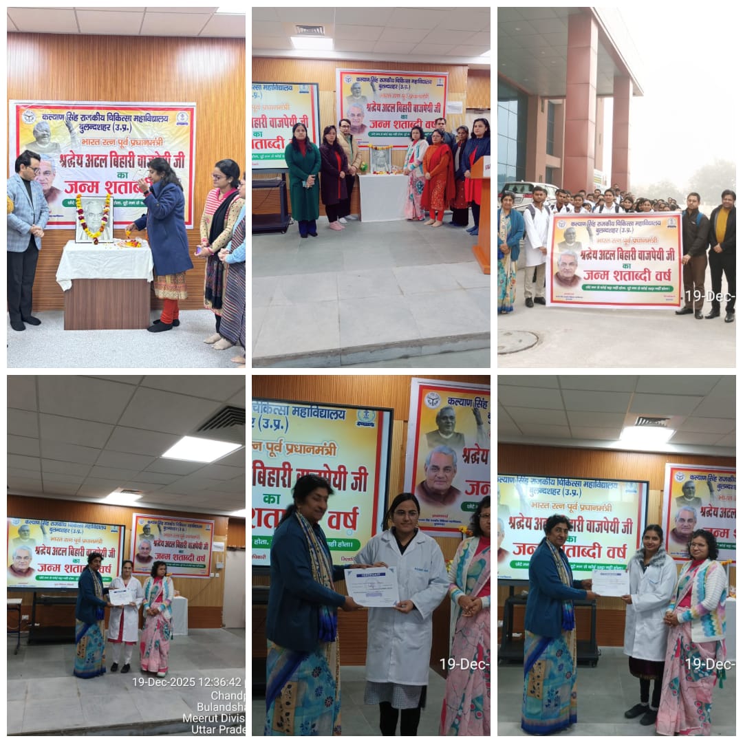 बुलंदशहर : भारत रत्न श्रद्धेय अटल बिहारी वाजपेयी जी के जन्म शताब्दी वर्ष के अवसर पर कल्याण सिंह राजकीय मेडिकल कॉलेज (KSGMC), बुलंदशहर में 16 से 25 दिसंबर 2025 तक विभिन्न शैक्षणिक, सांस्कृतिक एवं जागरूकता कार्यक्रमों का आयोजन किया गया।कार्यक्रमों में निबंध, क्विज, पोस्टर, रोल प्ले एवं काव्य पाठ प्रतियोगिताएं आयोजित की गईं, जिनमें विद्यार्थियों ने उत्साहपूर्वक सहभागिता की।समापन समारोह में उत्कृष्ट प्रतिभागियों को प्राचार्य डॉ. मनीषा जिंदल द्वारा पुरस्कार व प्रमाण पत्र प्रदान किए गए। इस अवसर पर अटल जी की कविताओं का सस्वर पाठ हुआ तथा उनके जीवन, विचारों और राष्ट्र निर्माण में योगदान पर प्रकाश डाला गया।