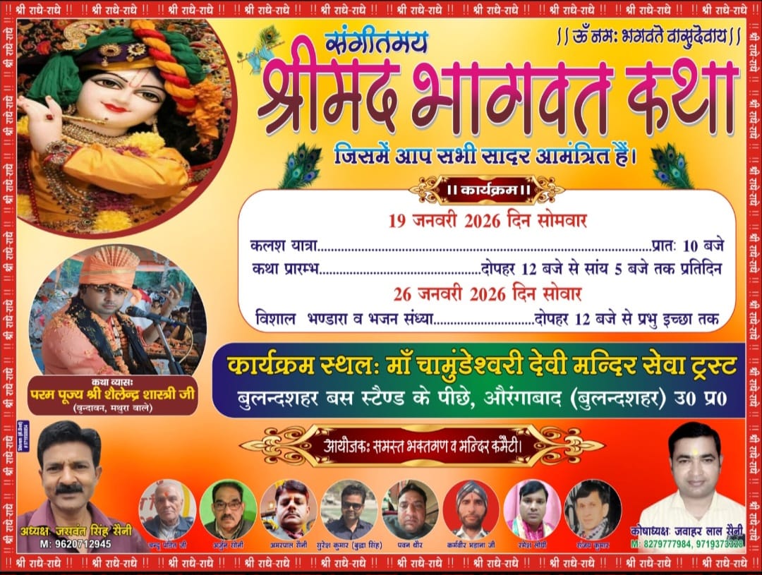 औरंगाबाद : बुलंदशहर चामुंडा मंदिर परिसर में भागवत कथा महोत्सव सोमवार से कलश यात्रा के साथ शुरू होगा। समापन 26 जनवरी को भंडारे के साथ किया जायेगा।मां चामुणेश्वरी देवी मंदिर सेवा टृस्ट के सौजन्य से चामुंडा मंदिर परिसर में सोमवार से प्रारंभ होने जा रहे भागवत कथा महोत्सव का शुभारंभ प्रातः दस बजे मंगल कलश यात्रा के साथ किया जायेगा। वृंदावन धाम से पधारे कथा व्यास आचार्य शैलेन्द्र शास्त्री प्रति दिन दोपहर बारह बजे से शाम पांच बजे तक भागवत कथा के प्रसंगों का श्रवण करायेंगे।उक्त जानकारी देते हुए टृस्ट के कोषाध्यक्ष जवाहर लाल सैनी ने बताया कि समापन 26 जनवरी को भंडारे के साथ किया जायेगा। मंदिर कमेटी के सेवादार कार्यक्रम को सफल बनाने के लिए दिन रात एक किए हुए हैं।
