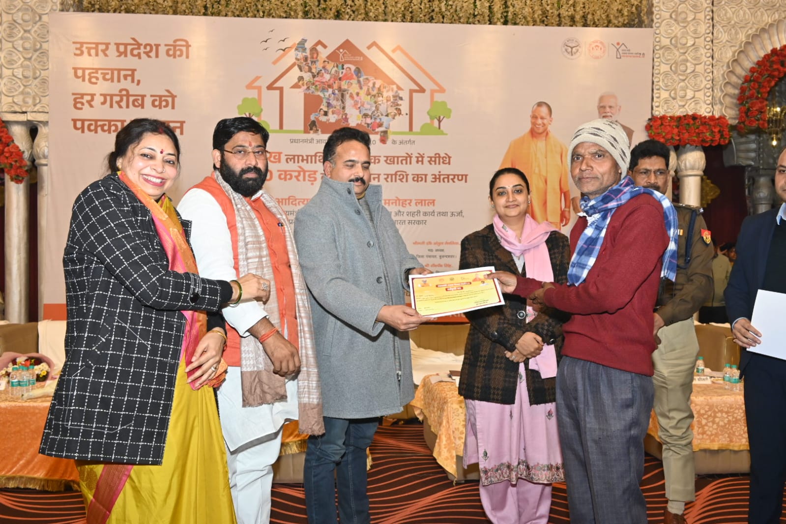 बुलंदशहर : में प्रधानमंत्री आवास योजना-शहरी 2.0 के अंतर्गत आज उत्तर प्रदेश के 02 लाख लाभार्थियों के खाते में 02 हजार करोड़ की अनुदान राशि का अंतरण करने के लिए लखनऊ में कार्यक्रम का आयोजन किया गया। कार्यक्रम का सजीव प्रसारण निकुंज हॉल में किया गया। मा0 मुख्यमंत्री जी द्वारा सिंगल क्लिक के माध्यम से प्रदेश के 02 लाख लाभार्थियों के खाते में पहली किस्त हस्तांतरित की। सजीव प्रसारण कार्यक्रम में जिलाधिकारी श्रीमती श्रुति, एसएसपी श्री दिनेश कुमार सिंह, मा0 विधायक अनूपशहर श्री संजय शर्मा, मा0 विधायक सिकंदराबाद श्री लक्ष्मी राज सिंह, मा0 एमएलसी श्री श्रीचंद शर्मा, मा0 अध्यक्ष नगर पालिका बुलंदशहर श्रीमती दीप्ति मित्तल, अपर जिलाधिकारी प्रशासन श्री प्रमोद कुमार पांडेय, पीओ डूडा डॉ0 अश्विनी कुमार सहित संबंधित अधिकारी एवं जनपद की सभी नगर निकायों से 500 लाभार्थियों द्वारा प्रतिभाग किया गया। कार्यक्रम ने में पीओ डूडा द्वारा बताया गया कि प्रधानमंत्री आवास योजना-शहरी 2.0 के अन्तर्गत जनपद बुलन्दशहर की 17 नगर पालिका परिषद/नगर पंचायतों में वर्तमान तक 5410 आवेदकों की स्वीकृति शासन स्तर से प्राप्त हुई है जिनमें से आज 3567 लाभार्थियों के खाते में प्रथम किस्त रू0 1 लाख की धनराशि मा० मुख्यमंत्री जी के कर कमलो द्वारा आज सिंगल क्लिक के माध्यम से लाभार्थियों बैंक खातों में सीधे अन्तरित की गई। कार्यक्रम के दौरान ही लाभार्थियों द्वारा प्राप्त धनराशि का मैसेज मिलने पर अपनी खुशी जाहिर करते हुए मा0 प्रधानमंत्री जी एवं मा0 मुख्यमंत्री जी का आभार व्यक्त किया।कार्यक्रम में जनपद की सभी निकाय से चयनित लाभार्थियों को मा0 जनप्रतिनिधियों एवं जिलाधिकारी महोदया सहित अधिकारियों द्वारा स्वीकृति पत्र भी वितरित किए गए। इस अवसर पर मयंक गोयल, जिला सूचना विज्ञान अधिकारी, मिशन प्रबंधक डूडासौरभ कुमार, अब्दुल रहमान बेग, इब्राहिम खान प्रधान सहायक मनोज मुनिशिपल इंजीनियर डूडा, नारायण सिंह, हिमांशु सामुदायिक आयोजक, डूडापीयूष कुमार ई डिस्ट्रिक्ट मैनेजर उपस्थित रहे।