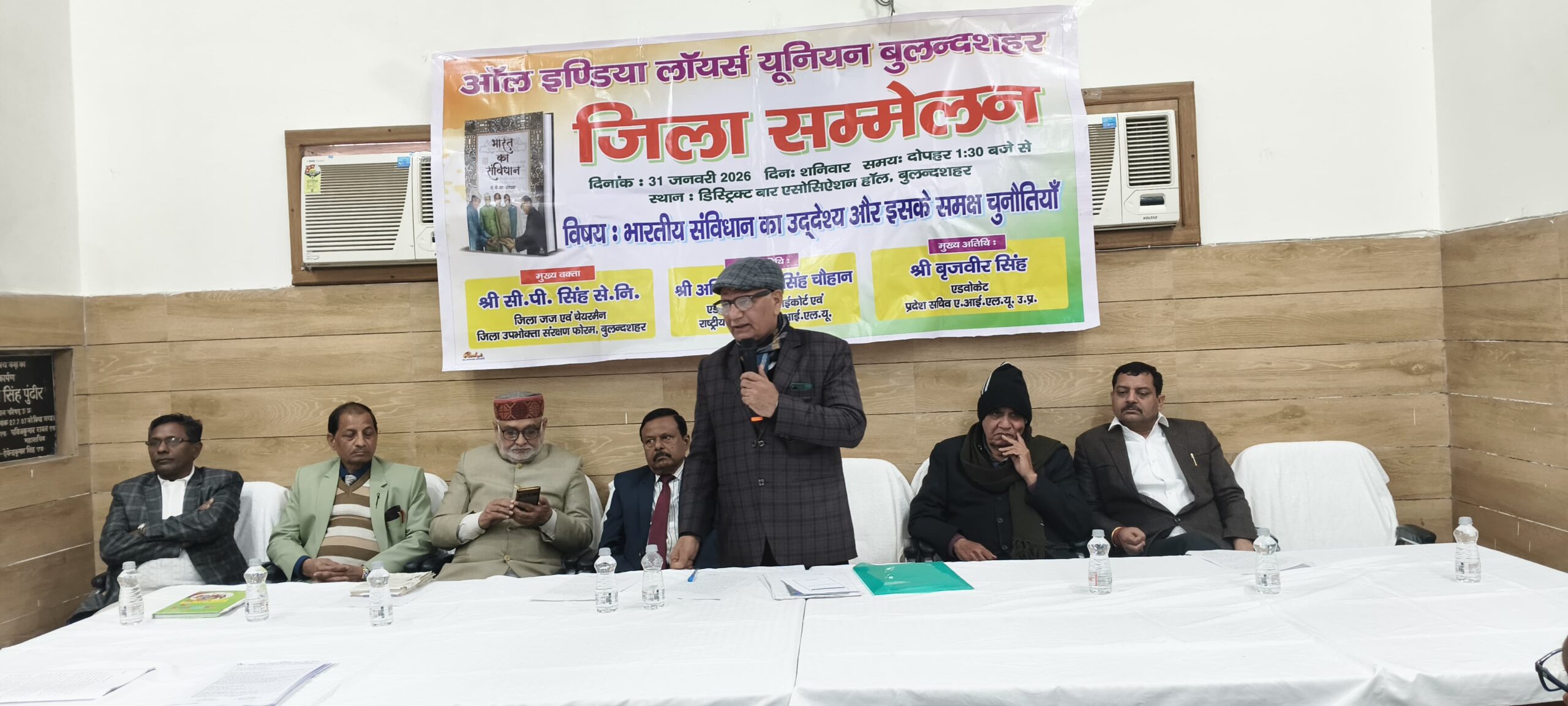 बुलंदशहर : उत्तर प्रदेश के जनपद बुलंदशहर के जिला बार एसोसिएशन में ऑल इंडिया लॉयर्स यूनियन द्वारा किया गया सम्मेलन का आयोजन जिसमें कार्यक्रम के मुख्य अतिथि पहुंचे अनिल कुमार सिंह चौहान एडवोकेट दिल्ली हाई कोर्ट एवं राष्ट्रीय कोषाध्यक्ष व प्रदेश सचिव ब्रजवीर सिंह का सर्वप्रथम अधिवक्ताओं द्वारा किया गया भव्य स्वागत इसके उपरांत कार्यक्रम की अध्यक्षता कर रहे एडवोकेट हुकम सिंह द्वारा भारत के संविधान के उद्देश्य पर प्रकाश डालते हुए दी समस्त अधिवक्ताओं को संविधान के प्रति जानकारी तो वही कार्यक्रम का संचालन कर रहे एडवोकेट तेजपाल सिंह ने सभी अधिवक्ताओं का कार्यक्रम में पहुंचने पर आभार व्यक्त करते हुए कहा कि भारत के संविधान के बारे में प्रत्येक नागरिक को जानकारी होनी चाहिए। इसके उपरांत कार्यक्रम में मुख्य वक्ता के रूप में पहुंचे सीपी सिंह सेवानिवृत्ति जिला जज एवं अध्यक्ष जिला उपभोक्ता संरक्षण फॉर्म बुलंदशहर ने प्रेस वार्ता के दौरान जानकारी देते हुए बताया कि हाल ही में सरकार द्वारा पारित किए गए यूजीसी कानून में काफी ऐसी चीज हैं जो अभी तक जनता के समक्ष नहीं पहुंची हैं तो जिसपर गंभीरता से विचार करते हुए आम लोगों को उसे नियम के बारे में पहले पूर्ण रूप से जानकारी करनी चाहिए और उसके बाद किसी भी तरह का विरोध प्रदर्शन करना चाहिए। वही कार्यक्रम के मुख्य अतिथि अनिल चौहान ने पत्रकारों से संवाद के दौरान बताया कि भारत का जो संविधान है वह सभी देशों के संविधान में सर्वश्रेष्ठ है लेकिन कहीं ना कहीं इसे लागू करने में कुछ खामियां रह गई थी जिन पर चर्चा करने के लिए आज इस सम्मेलन का आयोजन बुलंदशहर के डिस्ट्रिक्ट बार एसोसिएशन के तत्वाधान में किया गया है। कार्यक्रम के अंत में डिस्ट्रिक्ट बार एसोसिएशन के महासचिव अमित चौहान ने कहा कि ऐसी वर्ग के साथ-साथ अन्य वर्गों में भी गरीब लोग रहते हैं जिनके साथ किसी भी तरह का अन्याय नहीं होना चाहिए साथ ही उन्होंने कहा कि जो लोग पूर्ण रूप से सक्षम है उन लोगों का आरक्षण खत्म कर देना चाहिए चाहे वह किसी भी वर्ग का व्यक्ति हो।कार्यक्रम के दौरान संगठन के जिला मीडिया प्रभारी शैलेंद्र कुमार, सचिव शाहिद मलिक, पूर्व महासचिव उमेश कौशिक, प्रताप सिंह अंबा, राजकुमार, एडवोकेट सुमन, एडवोकेट, बबिता व शैलेंद्र लोधी सहित भारी मात्रा में अधिवक्ता सम्मिलित हुए।